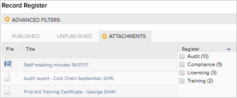 The Attachments Tab in the Records Register now only shows attachments from Audits, Compliance, Training and Licensing. This allows for easy searching for reports and certificates etc with less clutter from other registers. |