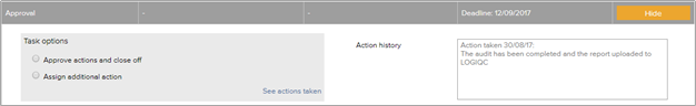 The Approval Officer for Audit, Compliance, Training and Licensing tasks now sees a roll-up of the action notes made. This saves heaps of time clicking around trying to check what’s been done before signing off. |