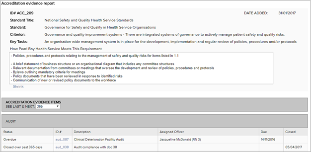 The Accreditation Evidence Report now displays detailed information about the standard and how your organisation complies with the requirements. |