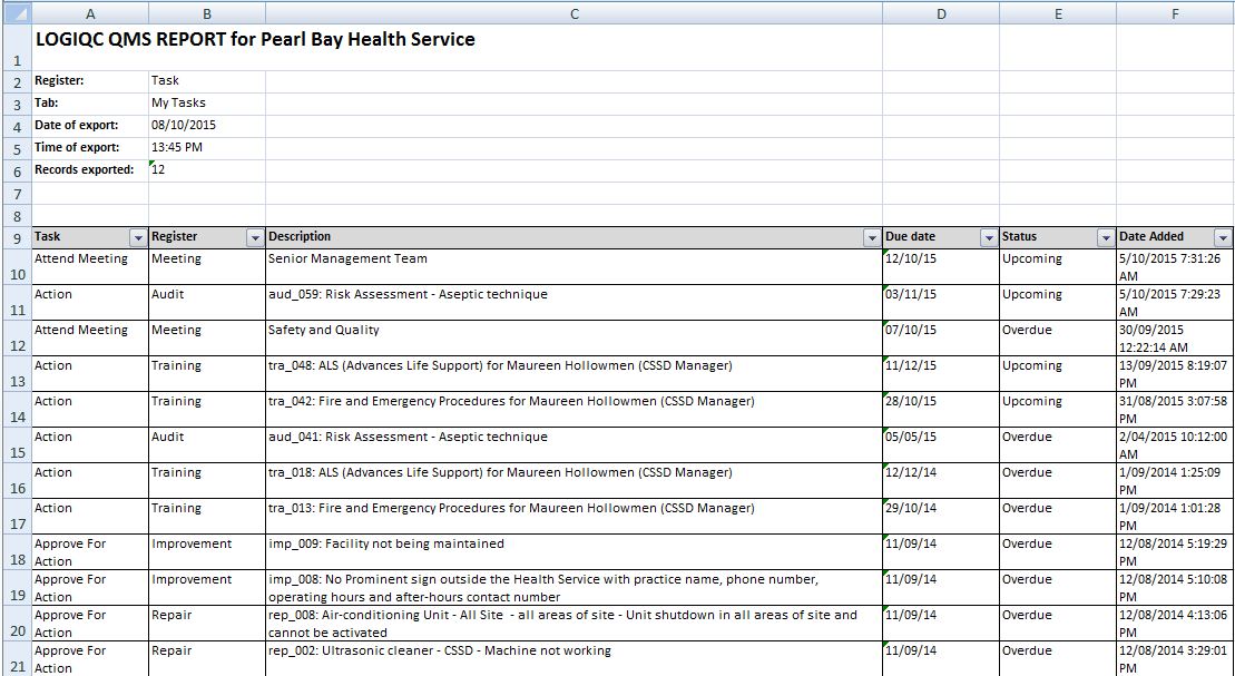2. This will launch an Excel document showing the items in the register tab you have selected.
