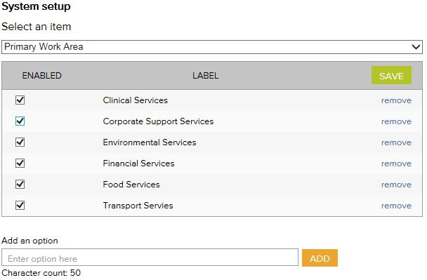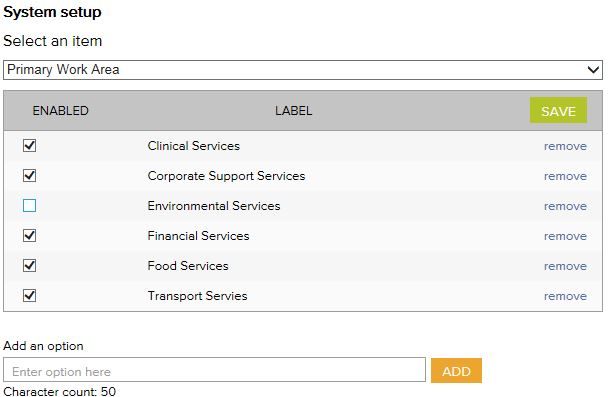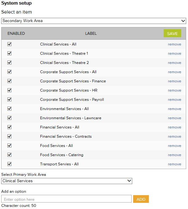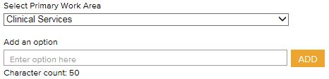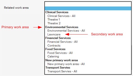 The Work Area drop down menu allows for primary work areas to be created with related secondary work areas or subcategories. Eg: