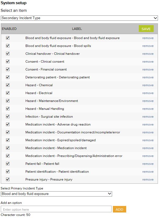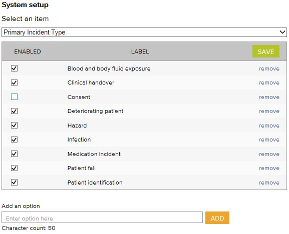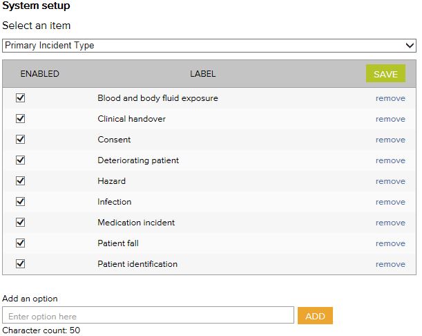1. Go to System setup and select Primary Incident Type from the drop down menu.
