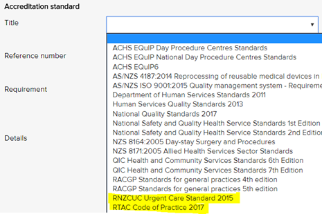 LQD-1875 and LQD-1876 Add new standard to the Accreditation Register: RTAC 2015 Add RNZCUC to Accreditation module |