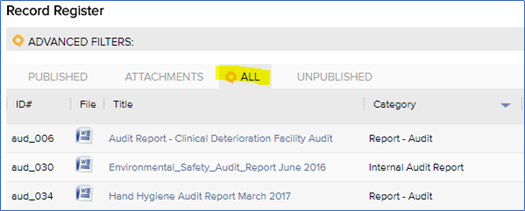 The new ‘All tab’ in the Records register combines ‘published’ records uploaded directly to the Records Register with ‘attachments’ which the system automatically displays in the Attachments tab when a user completes a task and adds a record. This means, for example, that all your audit reports or training certificates will be displayed and be searchable in a single tab. |