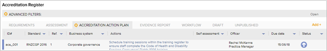 The accreditation action tasks are documented on the respective Accreditation Details Form. All accreditation action tasks will also be automatically listed on the Accreditation Action Plan tab within the Accreditation Module. The Accreditation Action Plan will display all action tasks relating to each Standard as well as information about the status, due date and the staff member who is required to complete the action (Action Officer).