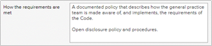 The specific assessment requirements for the Standard will be displayed below with a reference ID and description. In some cases, the “How the requirements are met” field will be prepopulated based on an example of how to meet this requirement. This field is editable, and the information we have provided is an example only. You will need to modify this information in order to reflect the specific ways in which your organisation meets these requirements. |