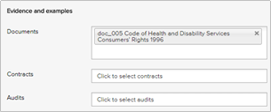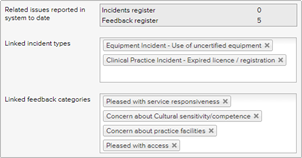 If there are incident types and feedback categories that relate to meeting this Standard, they can be linked to the Standard via this field. When incidents or feedback are reported, and these incident types / feedback categories are selected, details of these reports will appear as part of the Evidence Report of your organisation meets the Standard. This is useful when you want to demonstrate that you receive positive feedback, for example, in relation to access to care. Or when you need to demonstrate that how you respond to and manage types of incidents. |