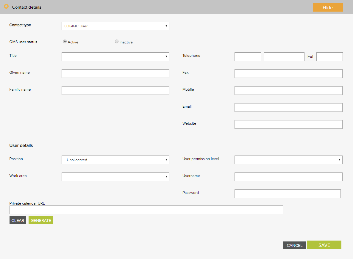To log in to LOGIQC, a person must have a user profile in the staff contacts tab. The staff contacts tab displays all system users who can access the system.