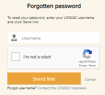 - Enter your username and password, and click log in. If you’ve forgotten your password, click on Forgot your password?, enter your username, tick the 'I'm not a robot' box and then click on 'Send link' and a reset password will be sent to your email address. (Note: if you can't remember your username, select 'Contact the LOGIQC help desk'.)